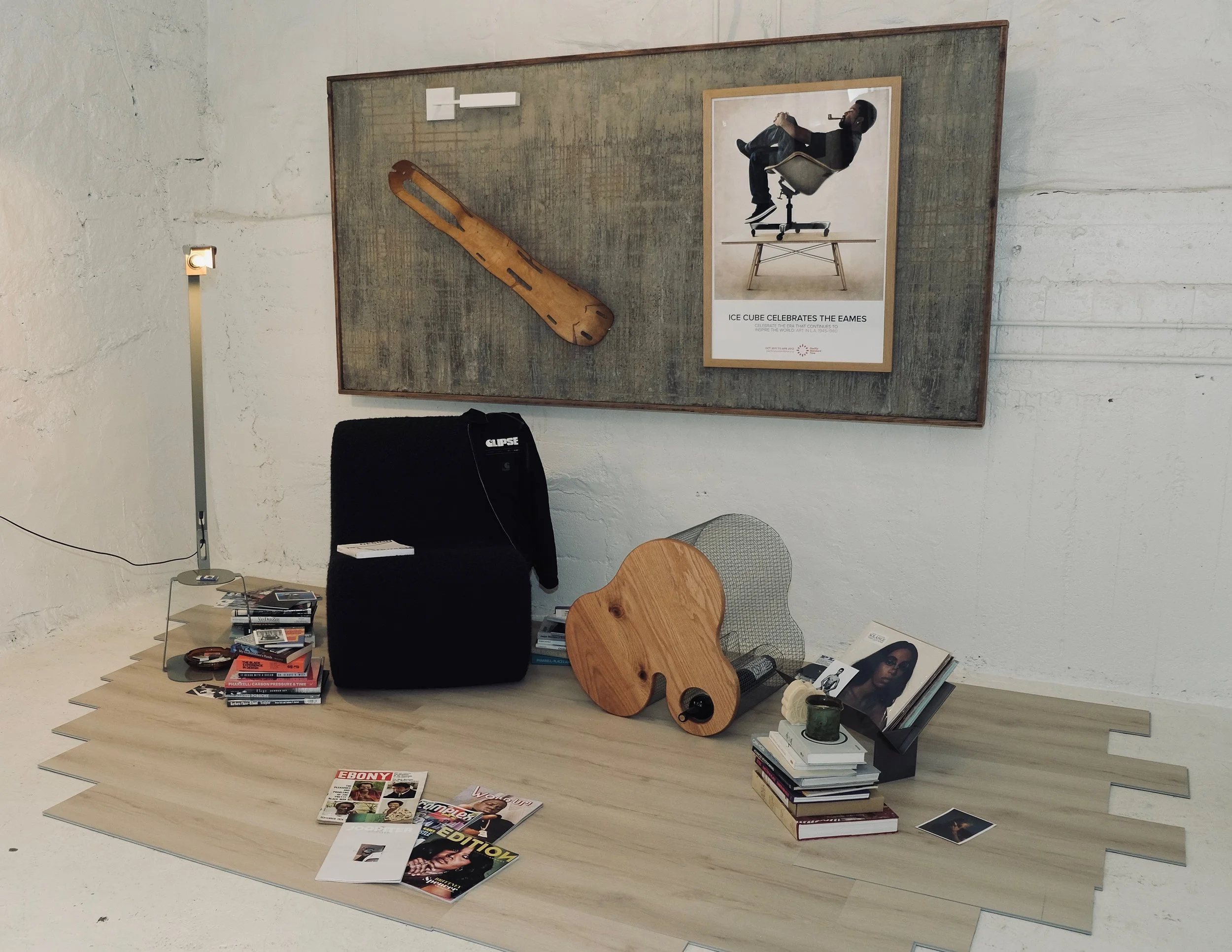 While the gallery at large was curated by Jailyn and Madison of Memento Gallery, “The Den” was a special area designed to make home come alive. Curated by Jailyn and James Williams III, this installation was meant to evoke the feeling of home in real time. This vignette explores the essence of home as a multidimensional concept through a curation of objects (design and art) that transcend beyond their domestic function.